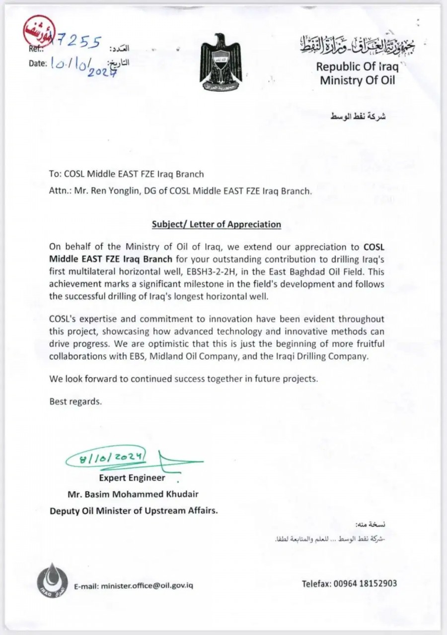 伊拉克石油部在信中提到 本次作业目标井的成功钻探 是伊拉克油田开发历史上的重大成就 彰显了中海油服在油气勘探领域的 持续创新和卓越执行力 对中海油服伊拉克技术团队所表现出的 精湛服务精细管理 表示高度认可